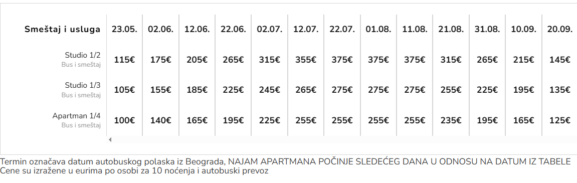 - prilikom spajanja smena prva smena se plaća prema cenovniku za autoubski prevoz (po osobi) a druga smena prema cenovniku za najam apartmana (ukupno)