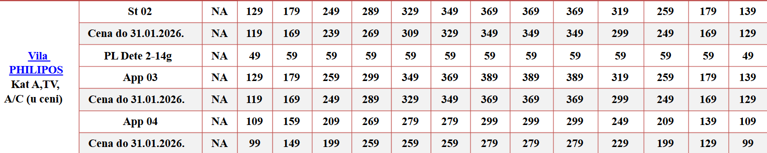 odabranom apartmanu/hotelu, za izabrani termin prema tabeli na bazi 10 noćenja;