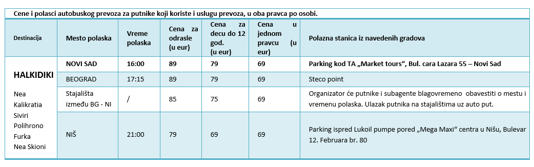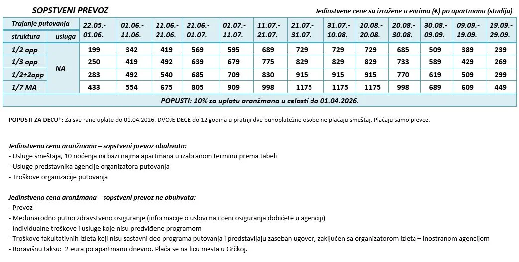 VAŽNO: Ministarstvo turizma Republike Grčke je najavilo uvođenje boravišne takse (turističke takse) od 01.01.2025. godine. Boravišna taksa u studijima/apartmanima iznosiće 2 eur dnevno po smeštajnoj jedinici i naplaćivaće je na licu mesta vlasnici smeštajnog objekta. Cene, doplate i uslovi prodaje su na sajtu čisto informativnog karaktera za sve informacije proverite zvaničan program putovanja Grčka – leto – 2026 – Halkidiki.