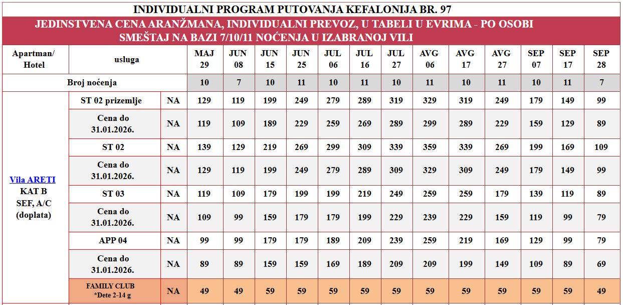 Vila Areti: I i II dete 2 – 14 god plaćaju cenu iz tabele, u pratnji 2 punoplatežne osobe po ceni ST02 i koristi ležaj u APP04 ili zajednički ležaj sa punoplatežnom osobom u ST02.