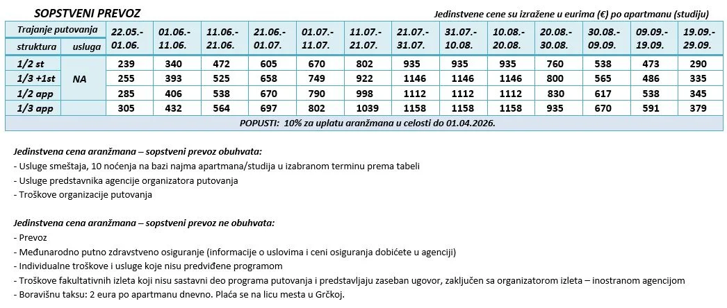 VAŽNO: Ministarstvo turizma Republike Grčke je najavilo uvođenje boravišne takse (turističke takse) od 01.01.2025. godine. Boravišna taksa u studijima/apartmanima iznosiće 2 eur dnevno po smeštajnoj jedinici i naplaćivaće je na licu mesta vlasnici smeštajnog objekta. Cene, doplate i uslovi prodaje su na sajtu čisto informativnog karaktera za sve informacije proverite zvaničan program putovanja Grčka – leto – 2026 – Halkidiki.