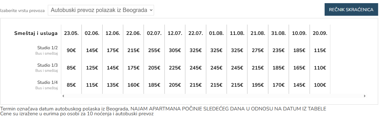 Dvokrevetni studiji (1/2 std) imaju dva standardna ležaja ili francuski ležaj, trokrevetni studio (1/3 std) ima francuski ležaj I jedan standardni ležaj, studio za četiri osobe (1/4 std) ima dva francuska ležaja.