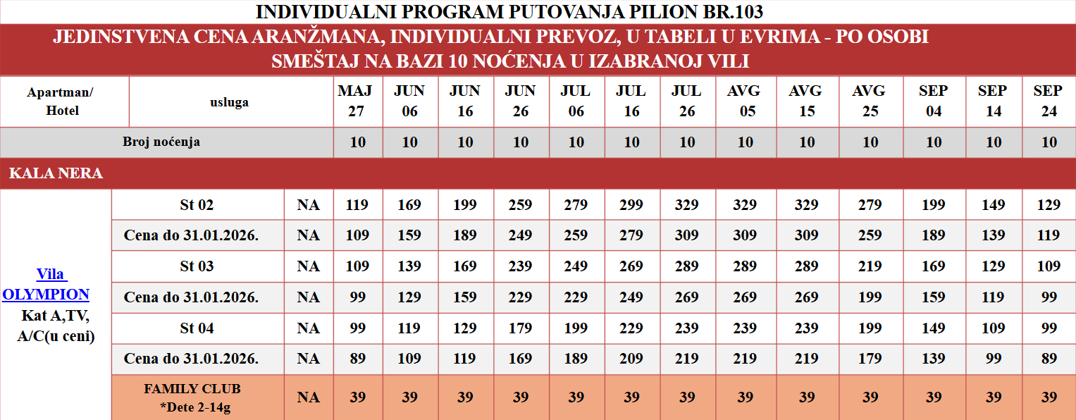 • odabranom apartmanu/hotelu, za izabrani termin prema tabeli na bazi 10 noćenja;