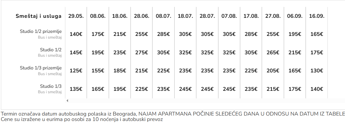 - prilikom spajanja smena prva smena se plaća prema cenovniku za autoubski prevoz (po osobi) a druga smena prema cenovniku za najam apartmana (ukupno)